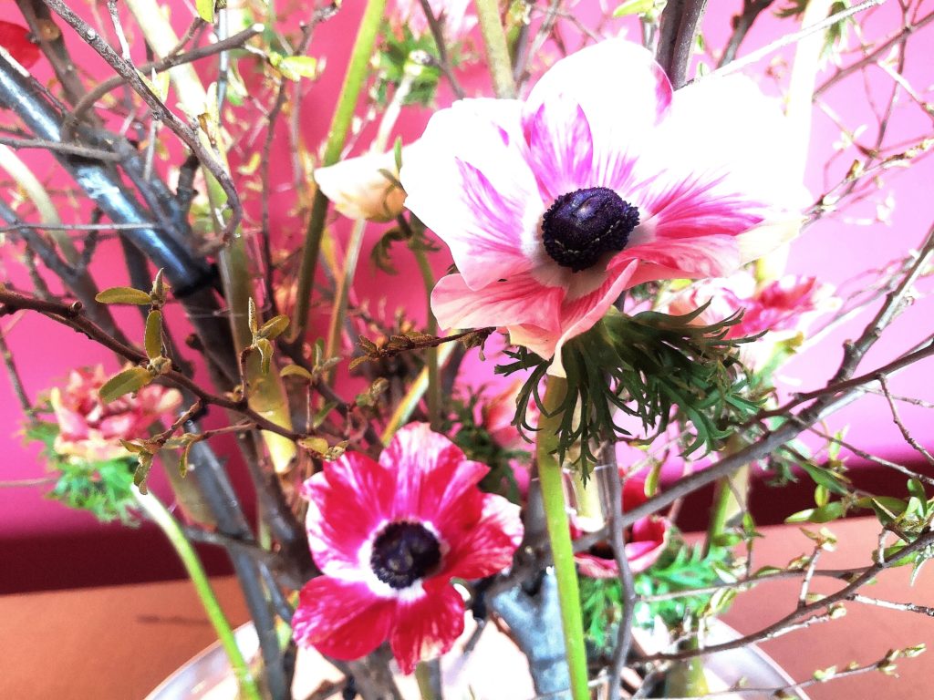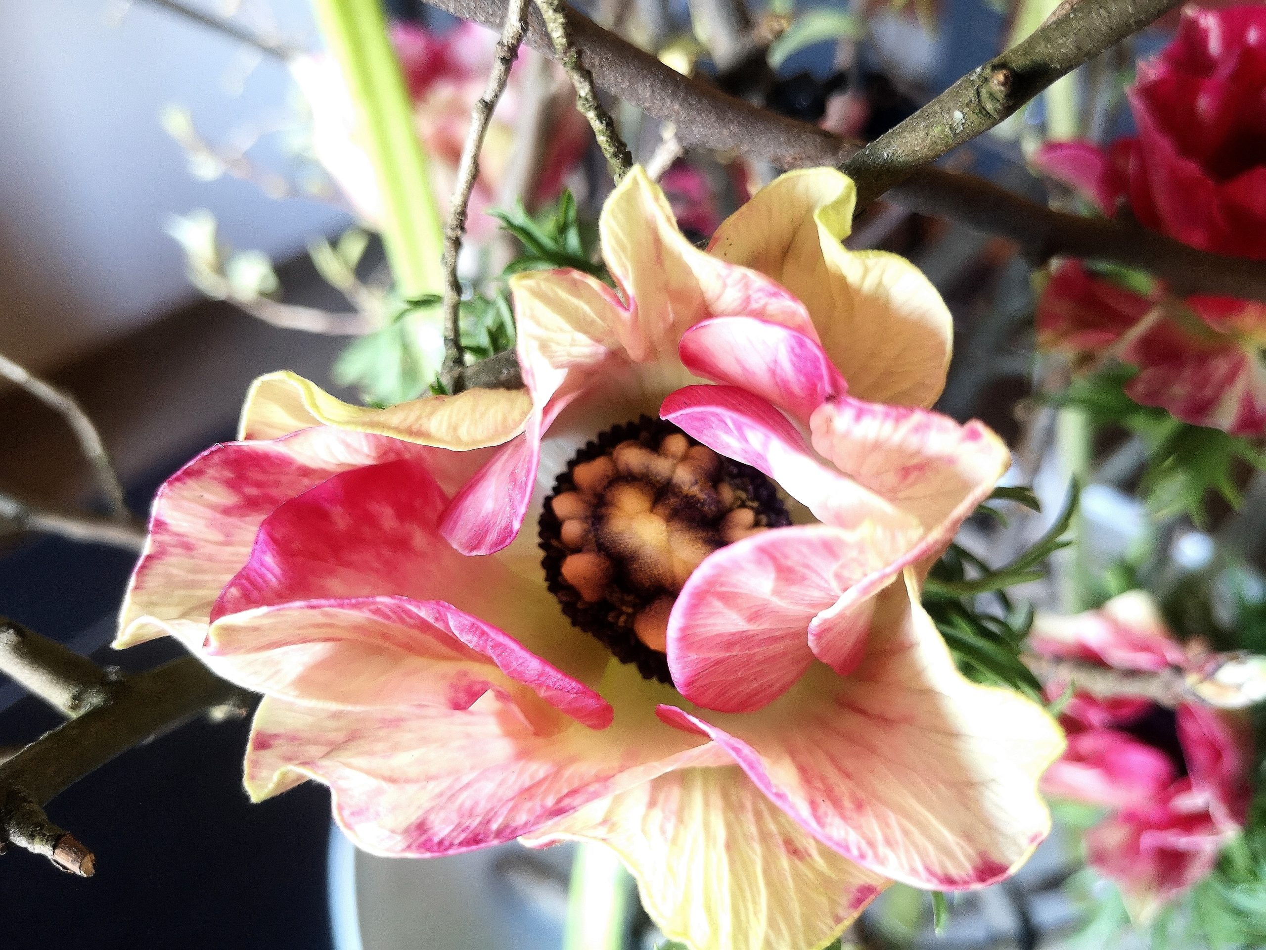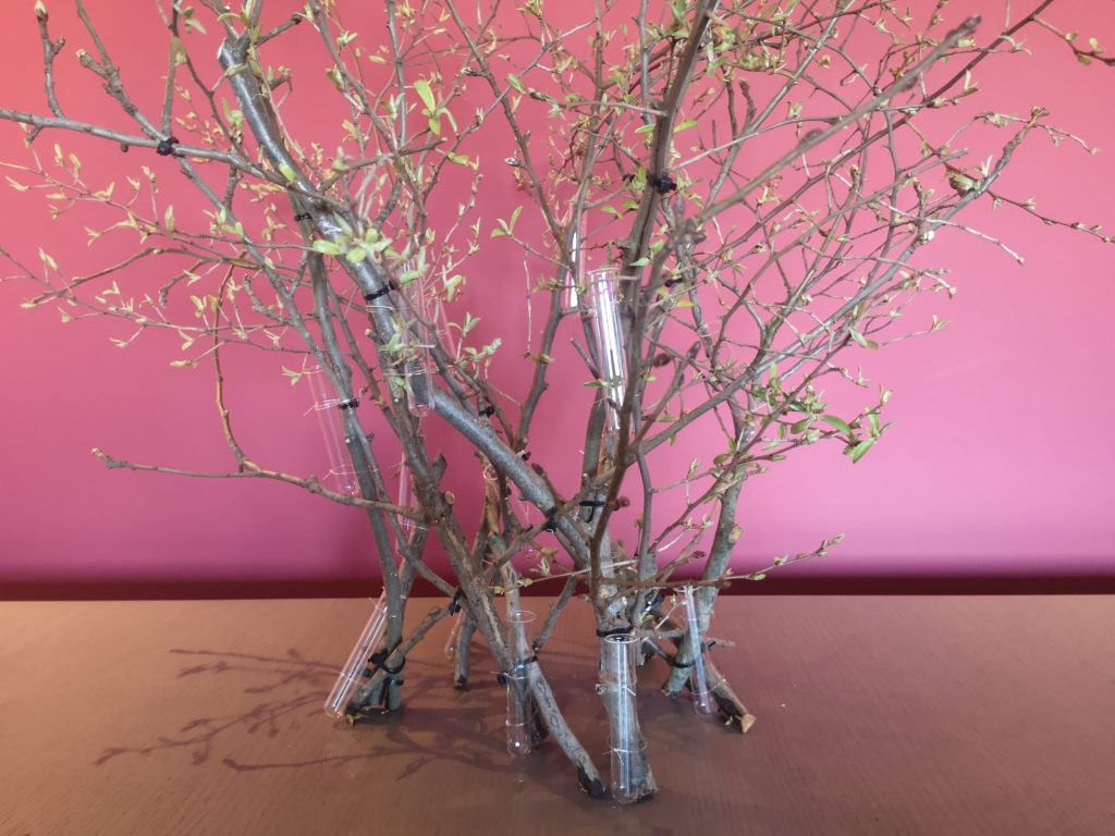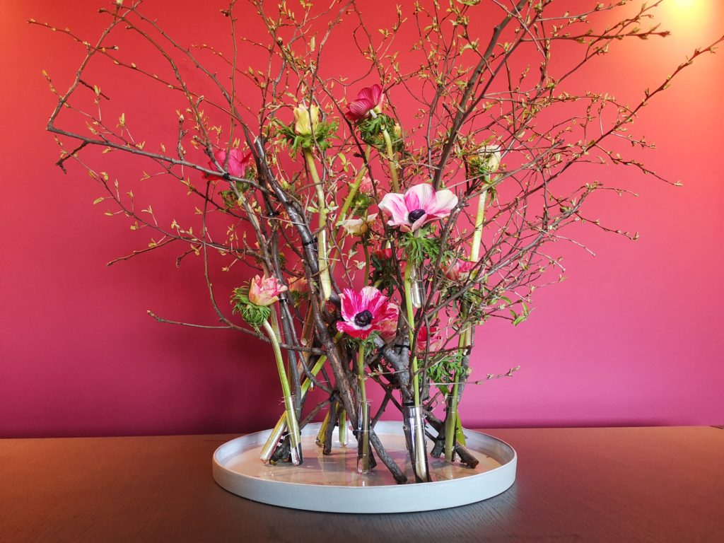 L’hiver touche à sa fin, on a envie de couleurs et de vie dans la maison. Les arrangements en branchages correspondent en tous points à ce désir de renouveau. Contrairement à l’arrangement autoporté classique, l’arrangement éprouvette me permet d’utiliser toutes les fleurs de saison : renoncules, anémones, jonquilles … car les tubes en verre vont donner une hauteur d’eau suffisante à l’hydratation de la plupart des fleurettes. Alors laissons libre court à notre créativité !