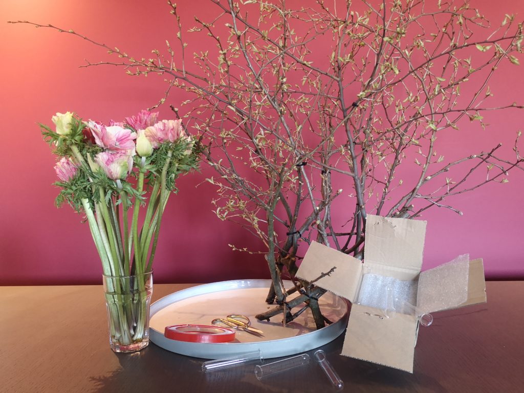 20 branches de 80cm, 20 anémones tigres, 2 paquets de serre-joints en plastique (Colson), du fil nylon, un plateau de quelques centimètres de haut qui peut contenir de l’eau, et 20 éprouvettes en verre entre 10 et 20 cm de hauteur.