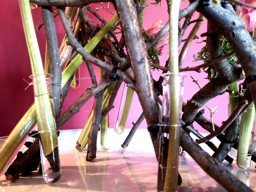 Je commence par attacher les branches entre elles, avec des colsons pour qu’elles tiennent à la vertical. Il est important que toutes les branches reposent sur le même plan, sinon elles ne tremperont pas dans l’eau et les bourgeons ne s’ouvriront pas. Il est également important de créer un volume cylindrique pour que l’arrangement soit beau à 360°. La structure est solidement attachée, absolument stable. Je peux maintenant attacher mes éprouvettes avec du fil nylon. Je dispose 70 % d’entre elles à la base de l’arrangement et le reste un peu plus en hauteur. Chaque éprouvette est attachée sur 2 niveaux ( à la hauteur du col et au dessus de l’arrondi du fond), le plus proprement et le plus discrètement possible.