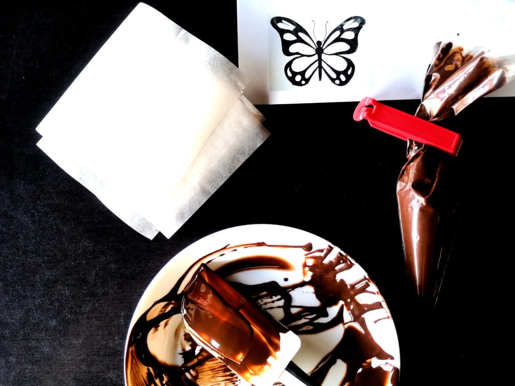 35 g de chocolat comme vous voulez (noir, blanc, lait), une poche à douille jetable, une pince en plastique, le chablon papillon imprimé, l’accordéon en carton et du papier sulfurisé.