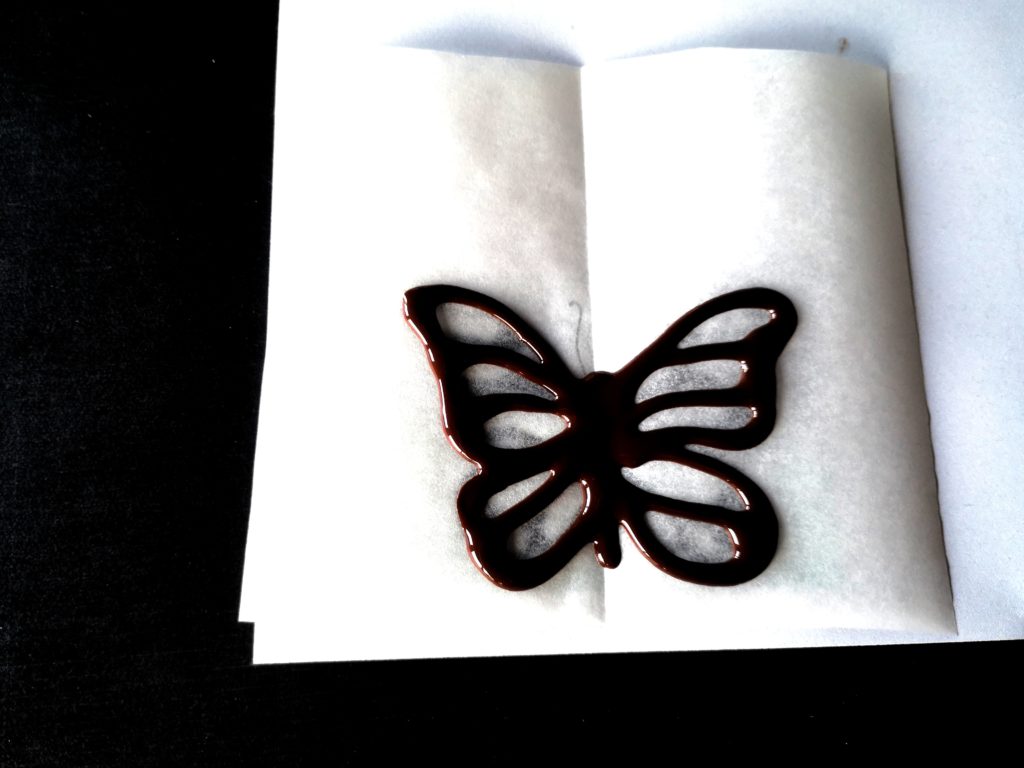 Dès que mon papillon est dessiné, je le dispose dans la forme et dès que j’en ai 4, je les place immédiatement au congélateur (ils durcissent instantanément)